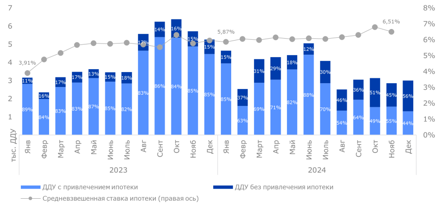 Ужесточение ипотечных программ (прекращение льготной ипотеки с господдержкой, исключение Санкт-Петербурга из программы IT-ипотеки, изменение условий семейной программы и исчерпание банковских лимитов по ней) и ультравысокие ставки рыночных кредитов привели к тому, что доля ипотеки в структуре сделок за 12 месяцев снизилась до уровня 69%. Это на 16 п. п. ниже, чем в 2023 г. Отметим, что в декабре 2024 г. доля ипотеки в структуре сделок достигла минимального уровня 44%, в следующем году прогнозируется устойчивость тренда.