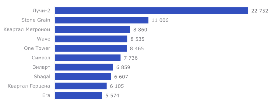 Суммарно за 2025 г. первенство среди проектов занял проект «Остров» от компании «Донстрой», в рамках которого было продано почти 100 тыс. кв. м жилья. Примечательно, что в прошлом году первое место среди проектов также занимал «Остров», год к году, объем проданной площади снизился на 15%. Второе место, как и по итогам 2024 г., занял масштабный проект Shagal от Группы «Эталон», в рамках которого было реализовано 89,4 тыс. кв. м жилья (год к году объем реализованной площади остался почти одинаковый с незначительной коррекцией -2%). Замыкает тройку проект «Лучи-2» Группы «ЛСР», где было продано 69,4 тыс. кв. м. В прошлом году тройку занимал проект «Событие» от компании «Донстрой».