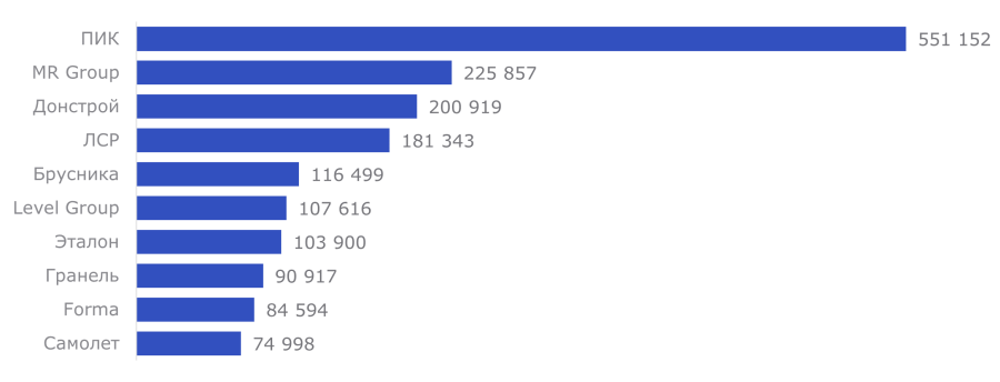 Среди застройщиков очередной год традиционным лидером по объему продаж в рамках Москвы в «старых» границах являет ГК «ПИК», которая реализована 551,1 тыс. кв. м жилья за 2025 г., при этом объем проданного жилья снизился на 15% по отношению к результатам 2024 г. Второе место занял девелопер MR Group, который сумел подняться выше на одну строчку рейтинга за год, реализовав суммарно 225,9 тыс. кв. м жилья. Компания «Донстрой», напротив, уступила второе место и в 2025 г. заняла третье, реализовав 200,9 тыс. кв. м. Четвертое место среди застройщиков, как и в 2024 г., заняла Группа «ЛСР», реализовав 181,3 тыс. кв. м. Закрывает пятерку лидеров «Брусника», за год поднявшаяся с десятого места, реализовав 116,5 тыс. кв. м жилья.