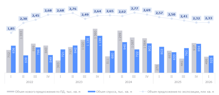Москва, 20 апреля 2026 г. По данным международной консалтинговой компании Nikoliers, в I кв. 2026 г. в Москве было зарегистрировано 10,3 тыс. ДДУ общей площадью 525 тыс. кв. м, объем проданной площади оказался на 44,9% ниже результатов VI кв. 2025 г. и на 34,6% меньше, чем в аналогичном периоде прошлого года. Отметим, что показатель спроса за I кв. 2026 г. – минимальный квартальный результат последних пяти лет. Отрицательная динамика связана с активным вымыванием доступного предложения в прошлые периоды, ограничением по программе «семейная ипотека», а также высокими рыночными ставками по кредитам, что ограничивает массовый спрос. Однако, на фоне снижения спроса замедлился и рост цены. В разрезе квартала фиксировалась отрицательная коррекция: с февраля по март 2026 г. средневзвешенная цена за кв. м снизилась до 635 тыс. руб. (- 0,7%), а в общем по итогам I кв. 2026 г. рынок продемонстрировал наиболее сдержанный за последний год рост показателя (+ 2,8%). В сегменте первичной жилой недвижимости продолжается ценовая корректировка в части отдельных проектов и лотов, застройщики более активно применяют гибкие инструменты реализации и дисконты, при этом общего снижения цен на протяжении года не ожидается.