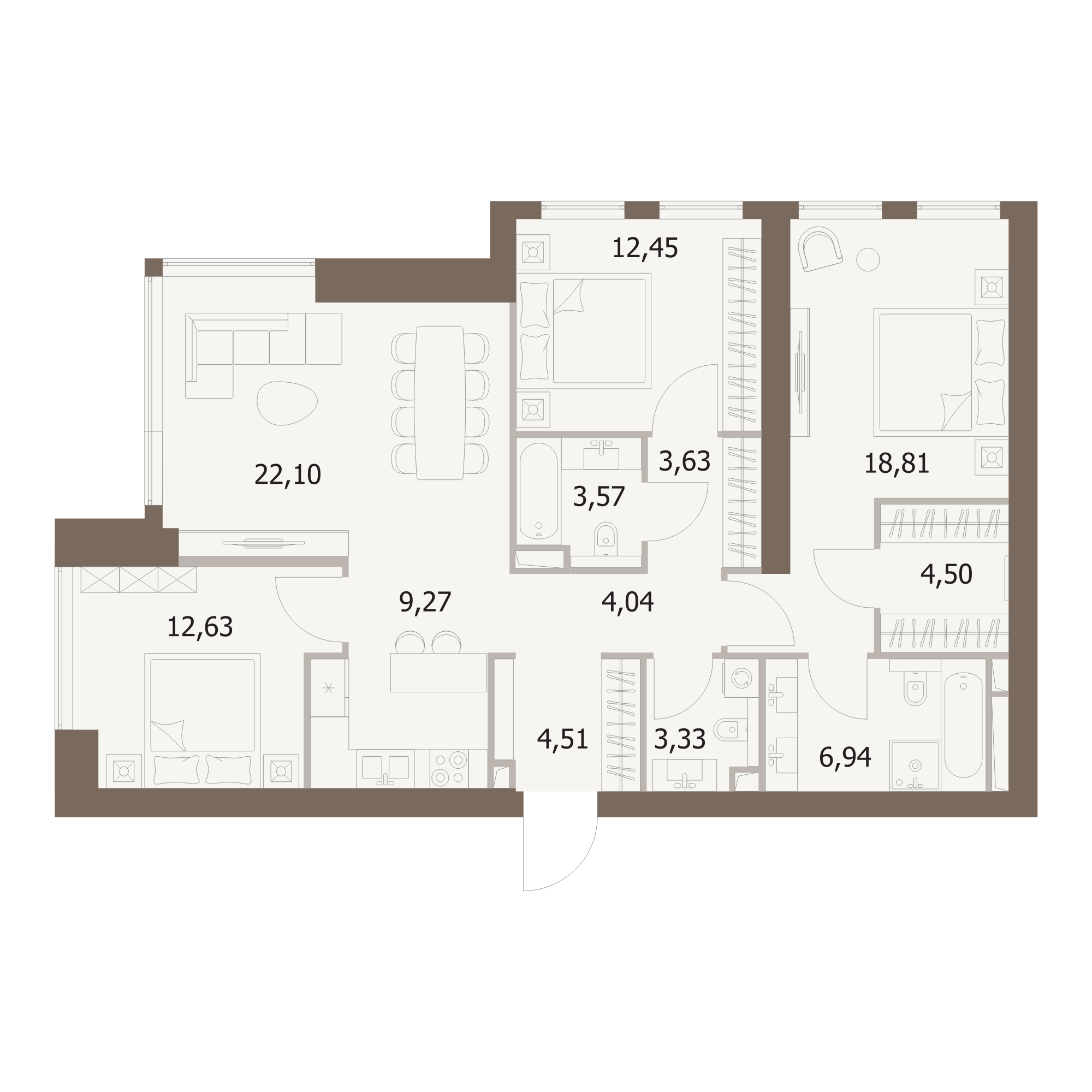 Все 596 квартир будут сданы с предчистовой отделкой (white box). Это позволит будущим резидентам комплекса сосредоточиться на творческой части ремонта, не связанной с организацией черновых работ. Эргономичные планировки всех помещений детально проработаны. В комплексе также расположены пентхаусы, квартиры с террасами и панорамным остеклением. Площадь однокомнатных квартир варьируется от 38 до 77 кв. м, двухкомнатных – от 60 до 84 кв. м, трёхкомнатных – от 87 до 114 кв. м и четырёхкомнатных – от 111 до 122 кв. м.