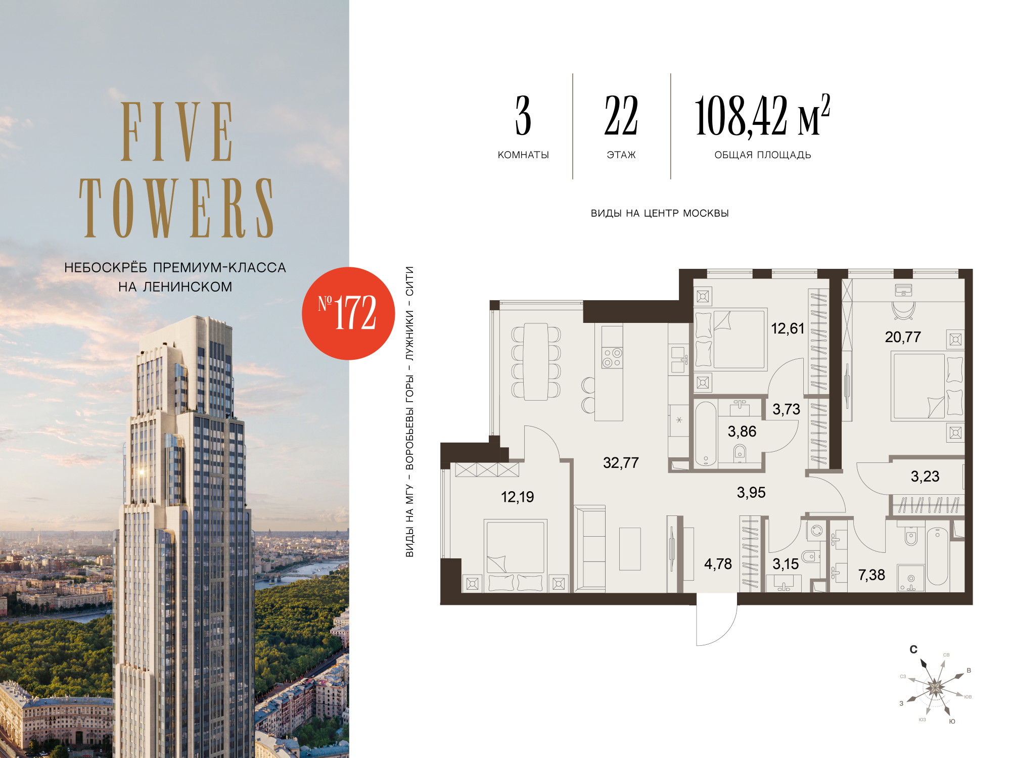 FIVE TOWERS – первый небоскрёб на Ленинском проспекте, который станет одной из главных и высотных доминант столицы. 75-этажный жилой комплекс премиум-класса изменит не только облик района, но и всей центральной части города. В начале Ленинского нет зданий такой этажности, поэтому из комплекса открывается потрясающая панорама на город – исторический центр, главное здание МГУ, Москву-Сити, спорткомплекс «Лужники» и Академию наук. В шаговой доступности – 500 га парков, образуемых «Музеоном», Парком Горького и парком «Воробьевы горы».